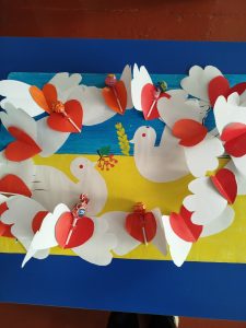 До Міжнародного дня миру вихованці групи «Розумники» (ЗДО «Дзвіночок») отримали щирі подарунки від школярів Новоселицького ліцею №1 — листівки з голубами миру.